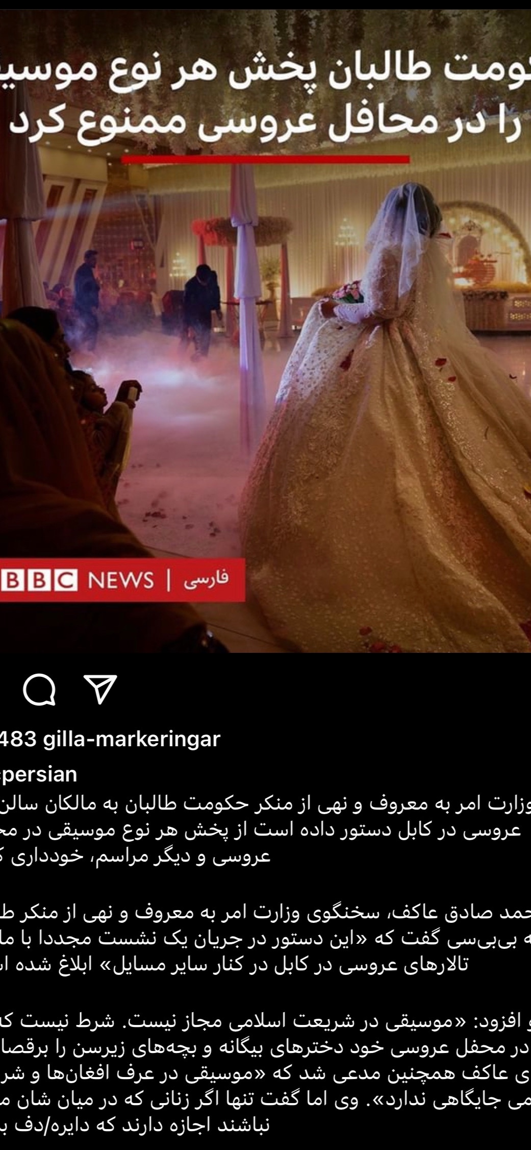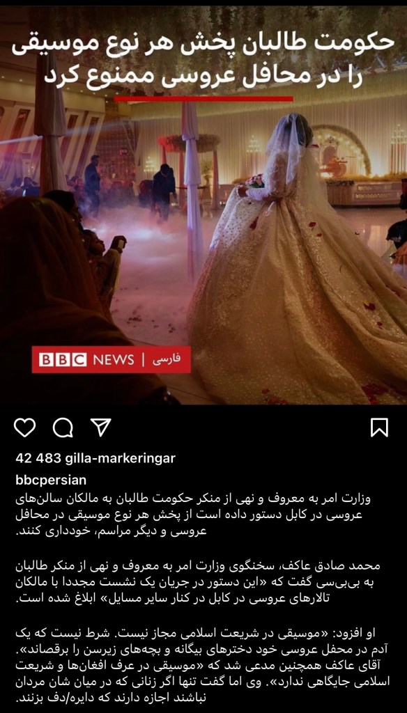 وزارت امر به معروف و نهی از منکر طالبان به صاحبان تالارهای عزوسی دستور منع پخش موسیقی در محافل عروسی را دادند